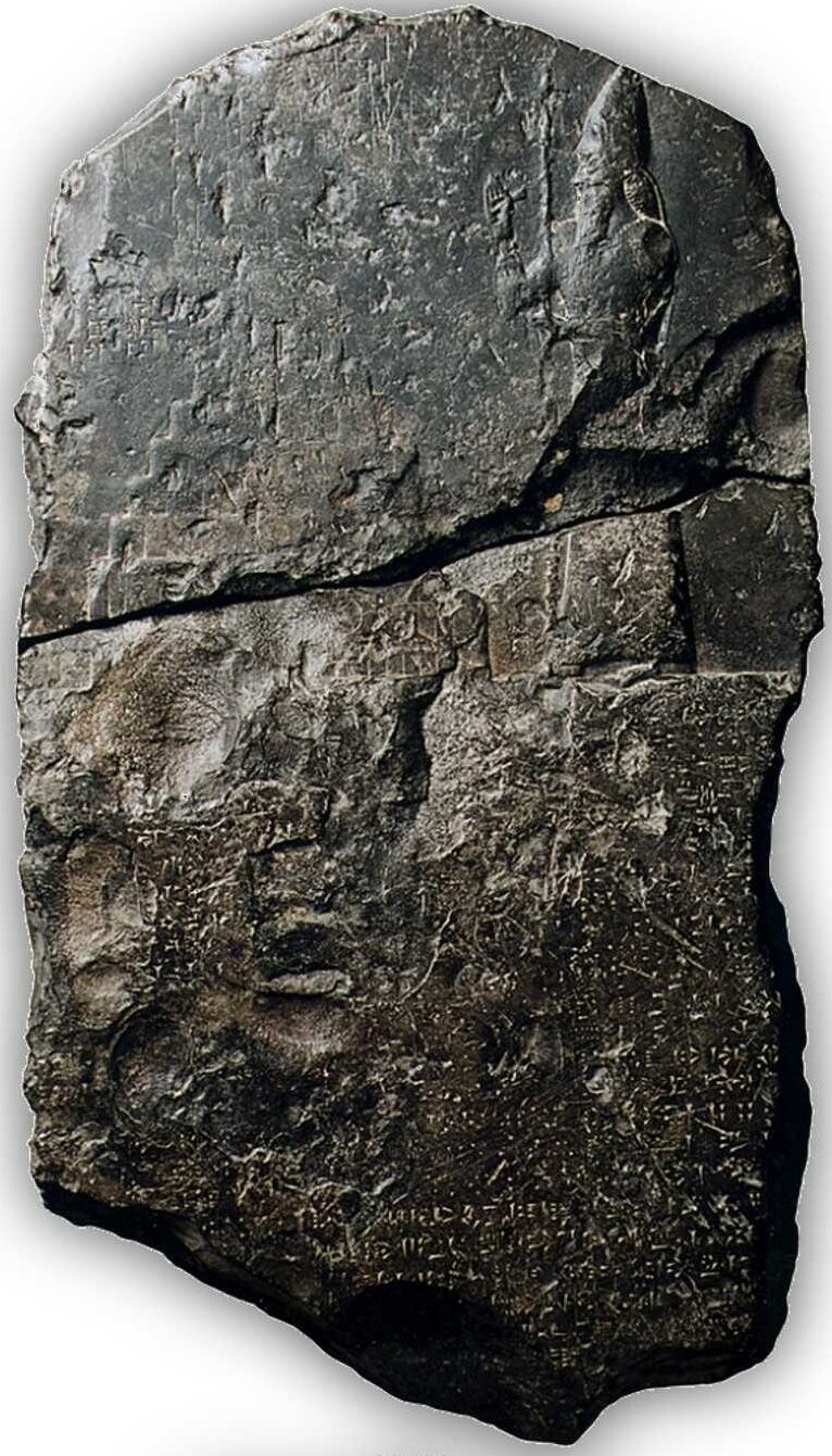 המלך נבוכדנצר השני ליד מבנה מדורג המכונה בפי הארכאולוגים 'מגדל בבל'. המקדש המשורטט מעל למגדל אופייני למקדשי בבל. תבליט על אבן שחורה, בבל, המאה השישית לפסה"נ