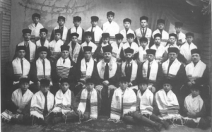 מקהלת בית הכנסת הגדול בווילנה, 1927. החזן משה קוסביצקי במרכז התמונה, מימינו המנצח עקיבא דורמאשקין. ראשון משמאל בשור השנייה שמחה קוסביצקי ומעליו דוד קוסביצקי | מתוך ספרו של עקיבא צימרמן 'זכור אזכרנו עוד'