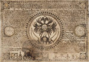 Each amulet in this set is dominated by a drawing of an animal-shaped angel topped by the name of one of the chariot creatures in Ezekiel’s vision: “As for the likeness of their faces, each had the face of a man; each of the four had the face of a lion on the right side, each of the four had the face of an ox on the left side, and each of the four had the face of an eagle” (Ezekiel 1:10). This amulet depicts the lion.