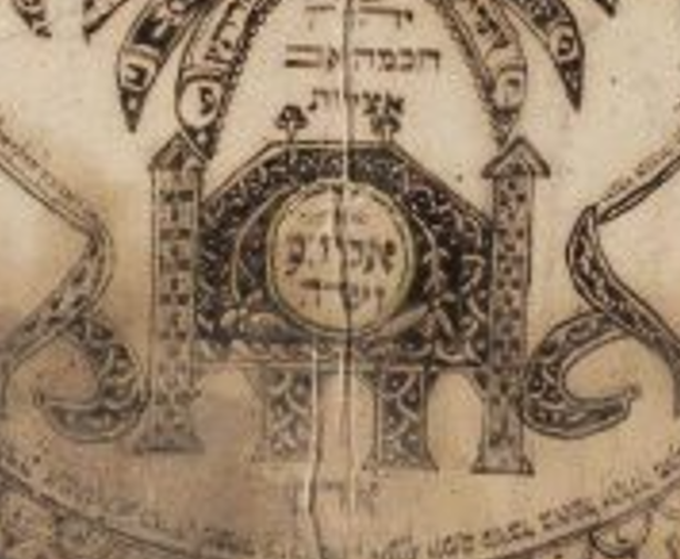 The stand beneath each angel bears the name of one of the four biblical couples from whom the Jewish people descends: Adam and Eve, Abraham and Sarah, Isaac and Rebecca, and Jacob and Leah. Rachel, who died in childbirth, is understandably omitted from the set. This amulet shows Abraham and Sarah.